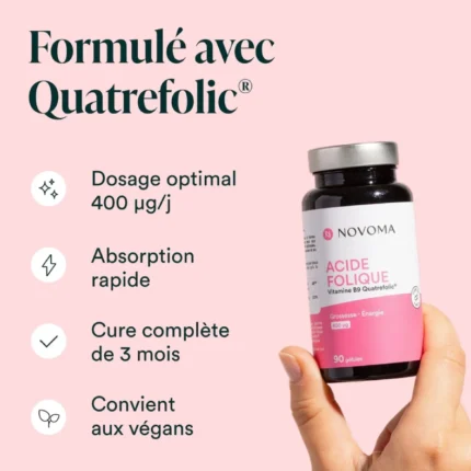 L’Acide Folique Vitamine B9 Novoma est un complément alimentaire essentiel pour accompagner les femmes avant et pendant la grossesse. Formulé à base d’acide folique sous sa forme active Quatrefolic® (5-MTHF), il offre une assimilation optimale par l’organisme. La vitamine B9 joue un rôle fondamental dans la croissance des tissus maternels, le développement normal du bébé et la formation des cellules sanguines.
