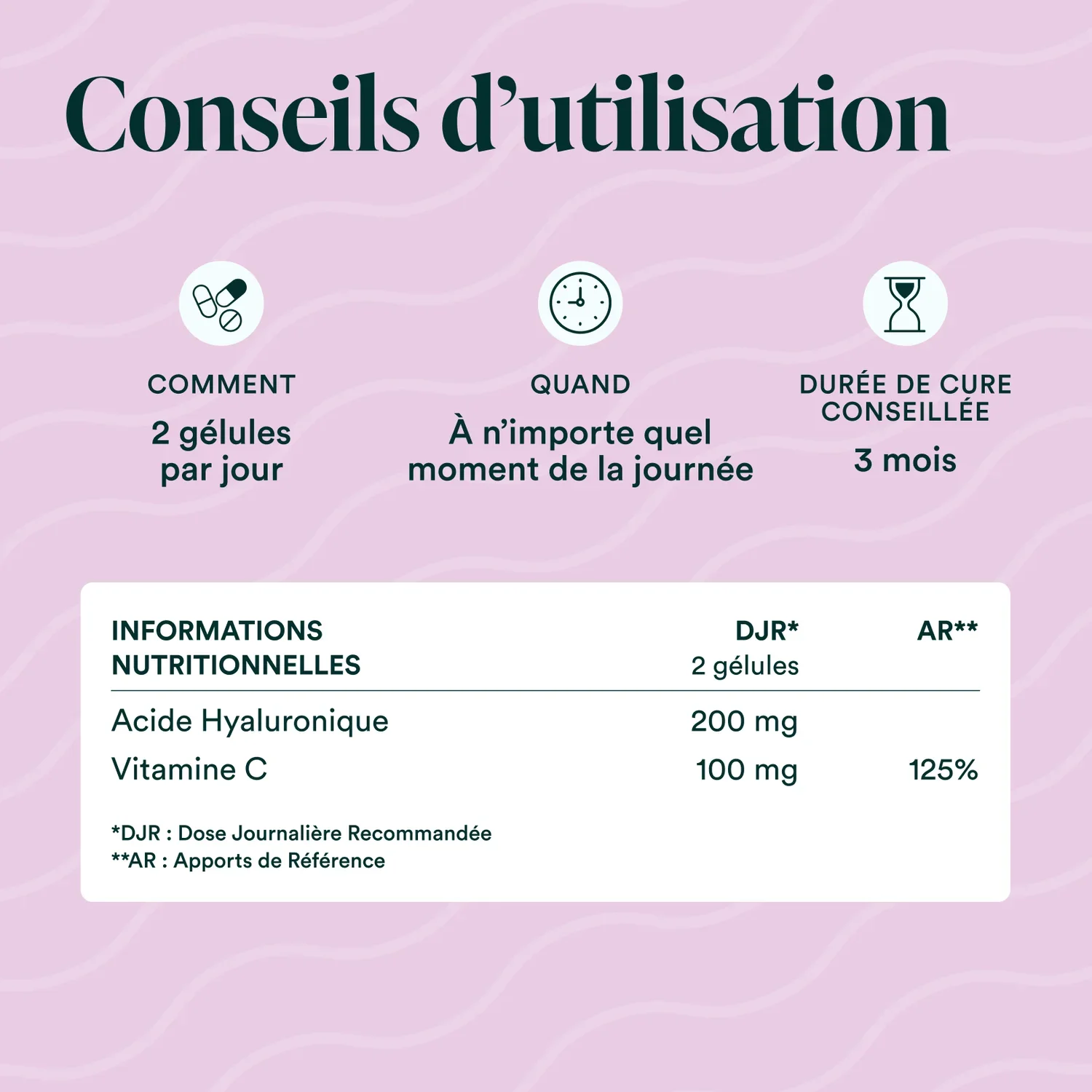 Cette formule a été conçue pour offrir un apport ciblé et bien assimilé d’acide hyaluronique, associé à la vitamine C, afin d’accompagner la peau au quotidien.