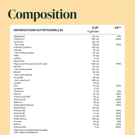 Sa composition repose sur des ingrédients sélectionnés pour leur complémentarité, dans une formule adaptée à une supplémentation régulière.