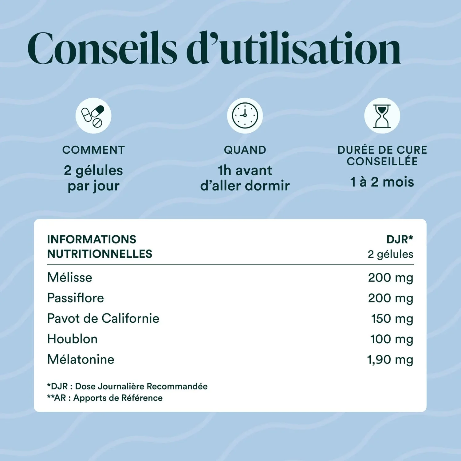 Prendre 2 gélules le soir, avec un verre d’eau, environ 1 heure avant le coucher.