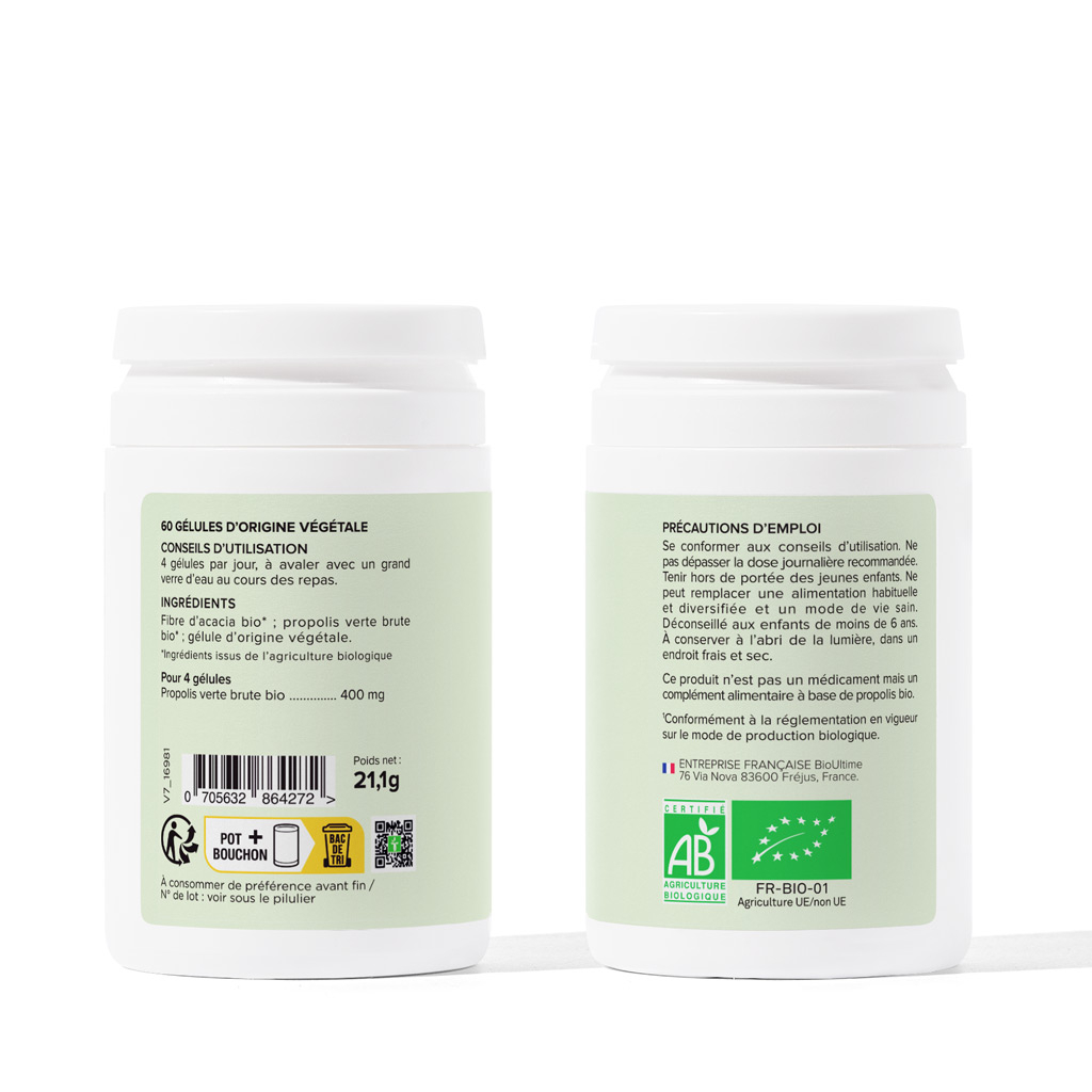 Fibre d’acacia bio, propolis verte brute bio, capsule d’origine végétale.