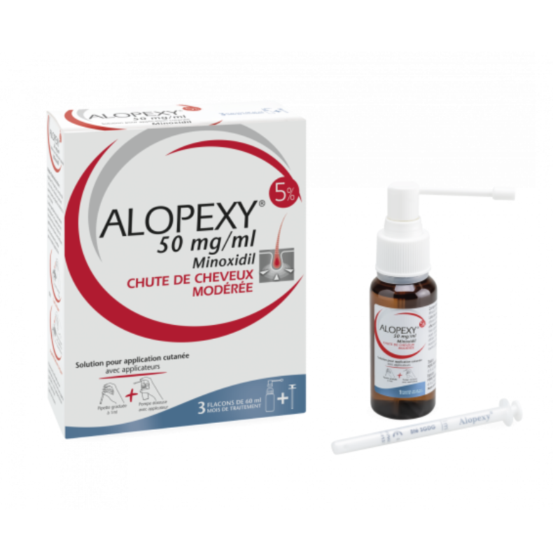 Alopexy 5 % (minoxidil 50 mg/ml) est une solution spécialement conçue pour l’homme adulte souffrant d’alopécie androgénétique modérée. Appliquez 1 ml deux fois par jour sur un cuir chevelu sain pour freiner la chute et stimuler la repousse. Usage réservé aux hommes – efficacité visible après 2 à 4 mois.