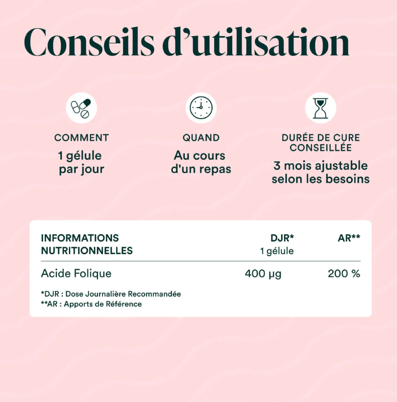 Ce complément contribue également à réduire la fatigue et à soutenir les fonctions psychologiques normales, grâce à son action sur le métabolisme énergétique. Chaque gélule apporte 400 µg de vitamine B9, la dose recommandée pour répondre aux besoins quotidiens des femmes en période de conception ou de grossesse.