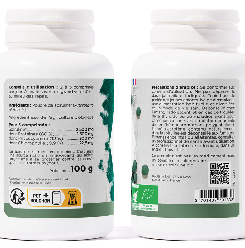 Issue d’une agriculture biologique certifiée, notre spiruline de qualité premium est naturellement titrée en phycocyanine et en chlorophylle. Grâce à son dosage optimal de 500mg par comprimé, elle constitue une source exceptionnelle de nutriments essentiels :